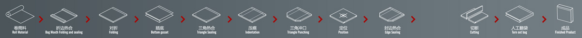 工序流程:卷筒料 折邊 穿繩 熱合 對折 插邊 定位 打孔 熱合 切斷一收集成品。
